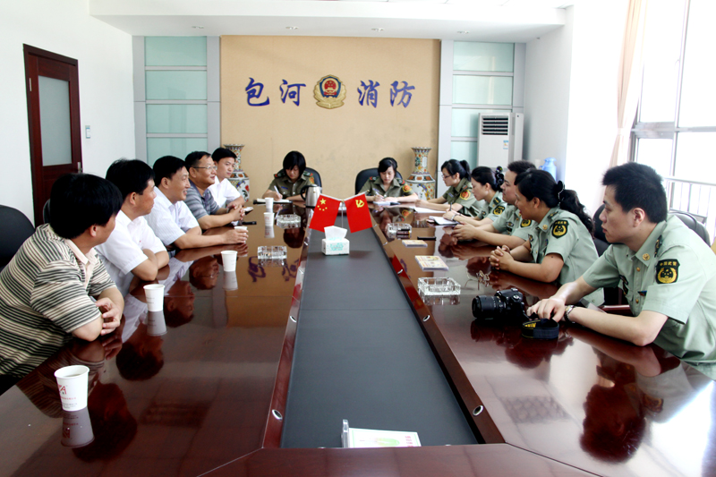 在消防大队三楼会议室,鲁健大队长、邵力教导员带领部队官兵热烈欢迎了张正副队长一行。鲁健大队长首先介绍了该大队近期工作情况和取得的成绩。张正副队长代表327队向该大队赠送了锦旗和慰问金,并感谢包河消防大队在消防安全培训以及消防实地应急演练等方面对327队的支持与帮助。双方共叙鱼水情谊,并就未来进一步加强联系达成了一致意见。