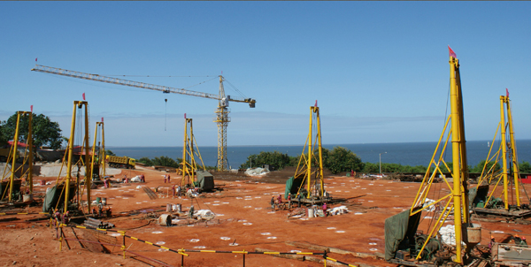 莫桑比克总统府项目自2月27日开工后,安岩公司共投入使用JPS--10型钻机设备8套,项目部48名员工克服了气候变化无常、早晚温差大、施工条件简陋等不利因素,施工钻孔灌注桩388根(直径600mm,孔深28m),浇筑混凝土3000多m3,在合同期内圆满完成总统府项目桩基工程,得到业主和省外经公司的肯定和赞赏。