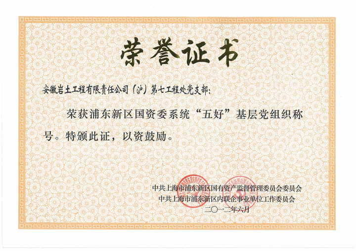 在6月19日召开的浦东新区国资系统庆七一暨创先争优活动交流表彰大会上,安徽岩土工程有限责任公司上海分公司第七工程处党支部荣获浦东新区国资委系统“五好”基层党组织称号。