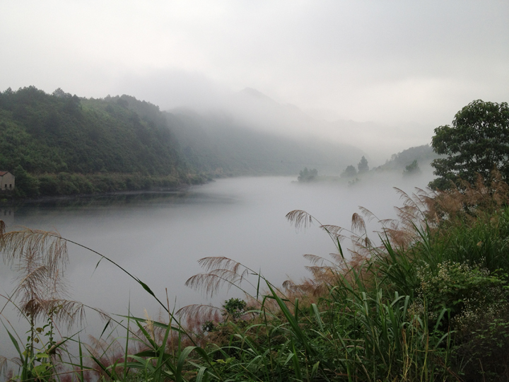 第二天早晨我一觉睡醒,已是5点30分,于是,急急忙忙起床,透过徽派建筑的格子窗户,果然看见潭上飘动的晨雾,若身披轻纱的仙女,在潭上随意地挥动着舞姿,美妙极了。啊!太美了!我顾不上梳妆打扮,急匆匆地跑出门外,在潭边狂奔着,疯狂地咔嚓咔嚓按动着快门,把这飘逸的晨雾定格在我的相机里,似乎更想冲进潭中,把自己也融进这美妙的晨雾里。