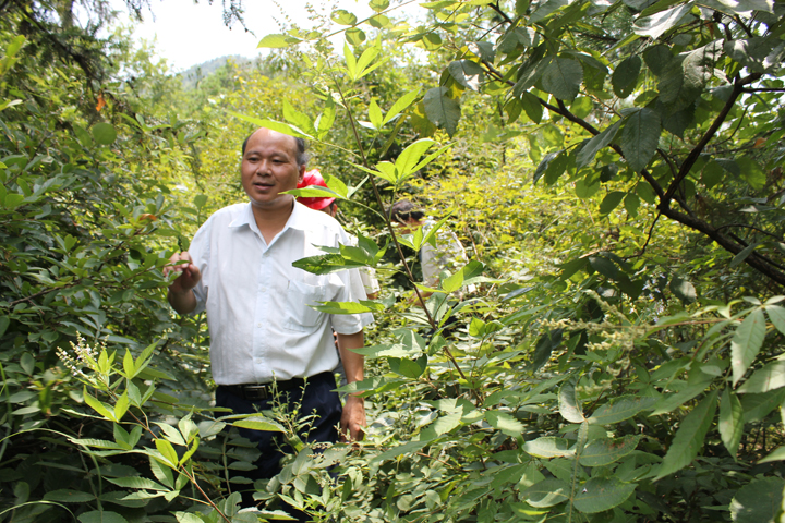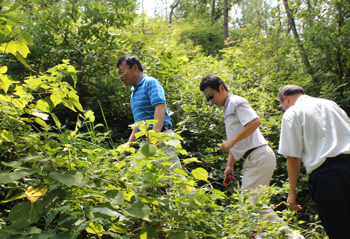 为了提高效率,钻探工程处经理周利胜找了位熟悉山路的村民,带上镰刀在前面带路,我们则并成一列跟在后面。一路荆棘密布,一个躲闪不及,那长着“倒挂刺”的枝丫就会在手臂留一道红印,渗了汗水,便是一小阵的火辣辣。我没停脚步,高高地举起相机,想记录这排前行的身影,感叹着地质队员的野外工作着实辛苦。想不到他们却笑说,“这个路算什么啊?比起皖南,那好多了!”