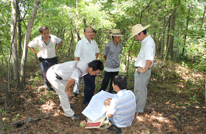 路程过了大半,有个地势稍微平缓的地方,大家都停下脚步休息会儿。从钻机出来就一直戴着安全帽的周经理,这才想起拿下帽子擦擦汗。他正跟带路的村民了解这一带的村镇分布及管辖范围情况,以便今后开展工作。另一边,安徽地调院的高级工程师蔡晓兵、工程师杨世学又拿出了GPS和图纸,几番比对下来,正席地而坐、在腿上铺着图纸画坐标的蔡工抬头说了句:“同志们,大家继续往前吧,还有一截!”听闻此,大家又继续向前进了。
