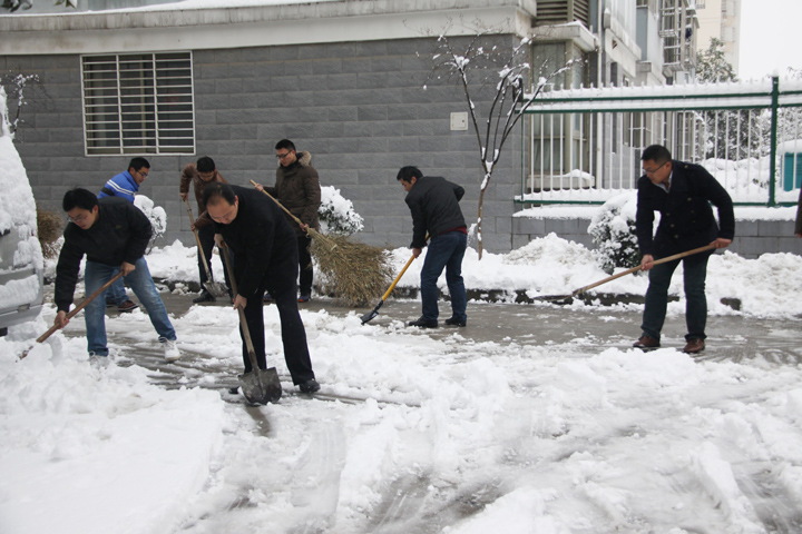 昨夜,一场春雪把合肥妆扮得银装素裹、分外妖娆。在人们欣赏美景的同时,深达10厘米厚的积雪也为百姓出行造成了困难。为了我队大院职工及家属出行安全,今天一上班,在队领导的带领下,机关各科室和实体干部职工纷纷走出办公室,居民也走出家门,用铁锹、扫帚清除地质大院道路上的积雪。经过近两个小时的劳动,道路上的积雪被清除得干干净净,此时,天空也仿佛感谢我们的劳动者,露出了灿烂的笑脸,残留的雪水在阳光的照射下,很快被蒸发。行人在路上又与平常一样迈起了轻松的步伐。