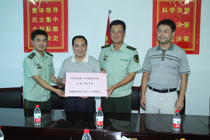 为庆祝中国人民解放军建军86周年,7月30日上午,队党委书记方招信、纪委书记、工会主席史俊等一行前往双拥共建单位——合肥市武警机动大队慰问武警官兵,并送上慰问金。