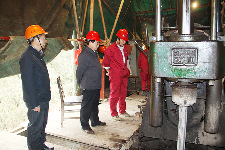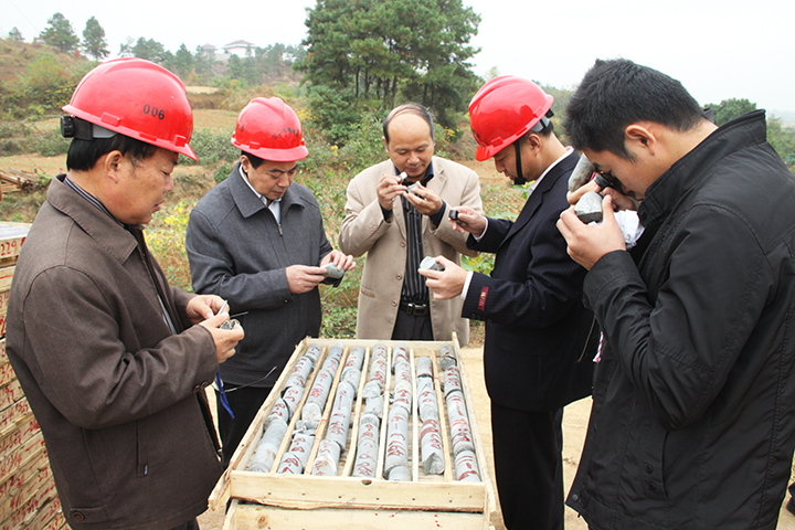方招信书记在副队长、总工程师张千明,总工办副主任汪龙虎的陪同下,先后来到矾母山铜矿普查组、小包庄铁矿普查组、沙溪铜矿深部及外围铜金矿普查组,现场察看岩矿心,深入机台了解生产情况及钻工们的收入和生活情况。地勘院副院长、矾母山铜矿普查项目负责人尚世贵,地矿院副院长、小包庄铁矿普查负责人高昌生及钻探工程处经理周利胜等在现场向方招信书记介绍了项目的进展和最新见矿情况。