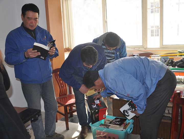 职工们在流动书箱里挑选图书