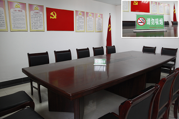 同时,在队二楼多功能会议室、各办公楼层会议室、接待室、党员活动室、队阅览室、资料室、职工医院、金源雅苑会所等室内公共场所均张贴了禁烟标牌。会议桌和茶几上,昔日的烟灰缸不见了,摆放上了台式禁烟标识。本次共计张贴标牌76块,置放禁烟标识台板20个。