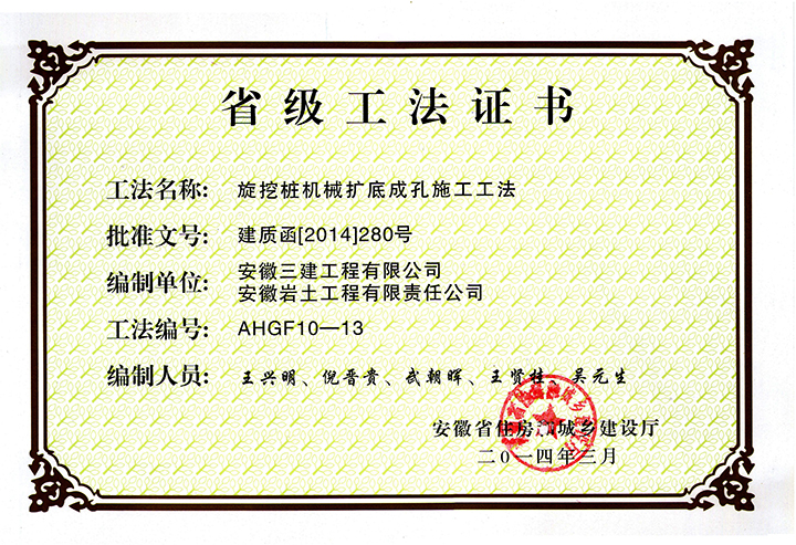 在去年底召开的安徽省2013年度建筑工程省级工法评审会上,队岩土公司申报的《旋挖桩机械扩底成孔施工工法》顺利通过评审。近日,通过公示,该工法正式获得安徽省住房和城乡建设厅的批准,实现了该公司在省级工法方面的零的突破。