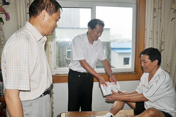 同行的王宁川主席在和耿志超的交谈中,鼓励耿志超战胜伤病。他说:你是我们的道德模范,你的伤情,牵动着大家的心,你平时献爱心,现在你遇到了困难,组织上也为你献上关爱。职工意外互助保障金正体现了这种关心和关爱,