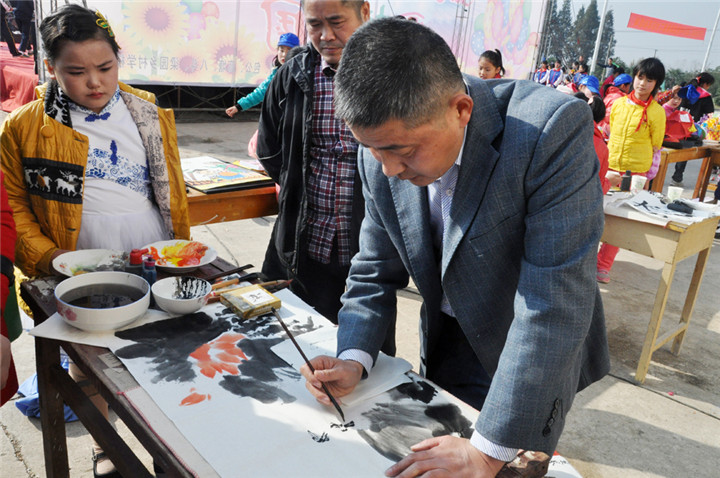 我队工会戴舒生系安徽省美术家协会会员,近日受邀参加了由肥东县文明办、教体局和财政局举办的“肥东县第二届乡村学校少年宫成果展”活动开幕式,并在现场挥毫泼墨,作就《硕果累累》、《红花映日》等国画写意花鸟作品,受到了在场领导及师生的热烈欢迎。
