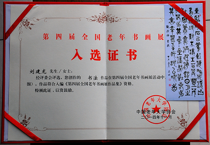 日前,我队退休职工刘建龙创作的书法作品,在第四届全国老年书画展活动中入选参展,并入编《第四届全国老年书画展作品集》。