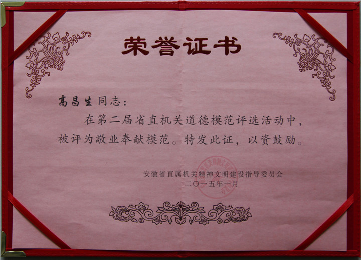 近日,安徽省直文明委发文表彰第二届省直机关道德模范。我队地质勘查院副院长、高级工程生高昌生喜获敬业奉献模范称号。此次评选活动共有72名来自省直机关各单位的同志获得道德模范称号,其中敬业奉献36人,孝老爱亲8人。
