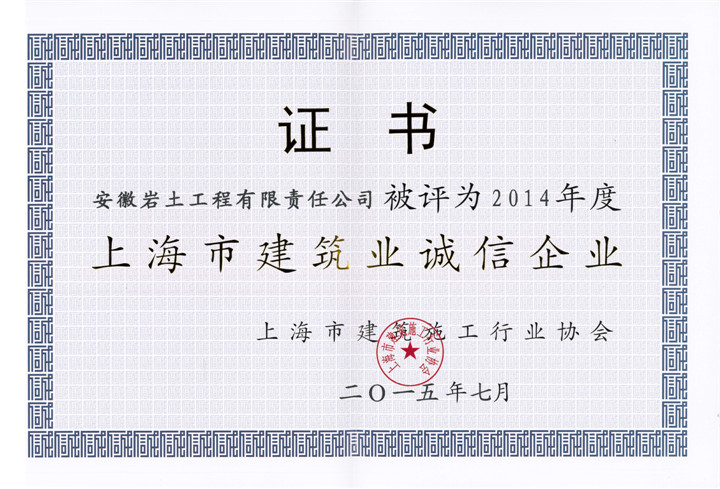 近日,安徽岩土工程有限责任公司通过了《上海市建筑施工企业诚信建设行业评价试行办法》和2014年度企业诚信建设相关考核内容,经上海市建筑施工企业诚信建设行业评价委员会审定后,被评为2014年度“上海市建筑业诚信企业”。