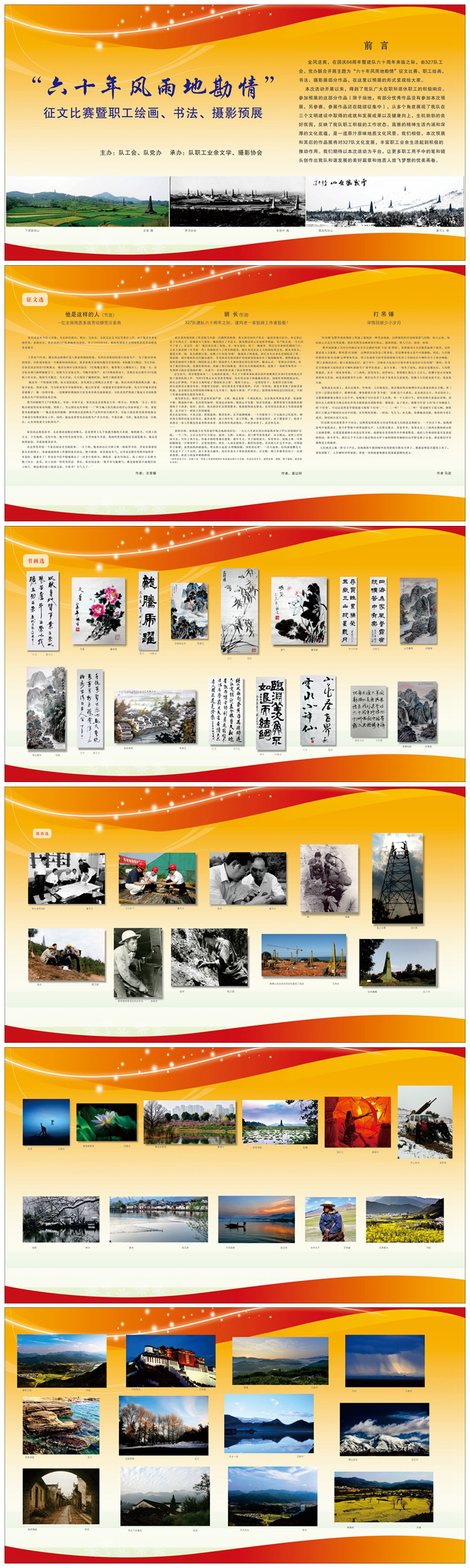 为庆祝建队六十周年,国庆期间,我队“六十年风雨地勘情”主题征文比赛暨职工绘画、书法、摄影展部分作品,共五十多(篇)幅,以预展的形式在队宣传橱窗展出。该活动由327队工会、党办联合开展,旨在让大家在国庆66周年来临之际,欣赏一道地矿文化风景,增添节日氛围。