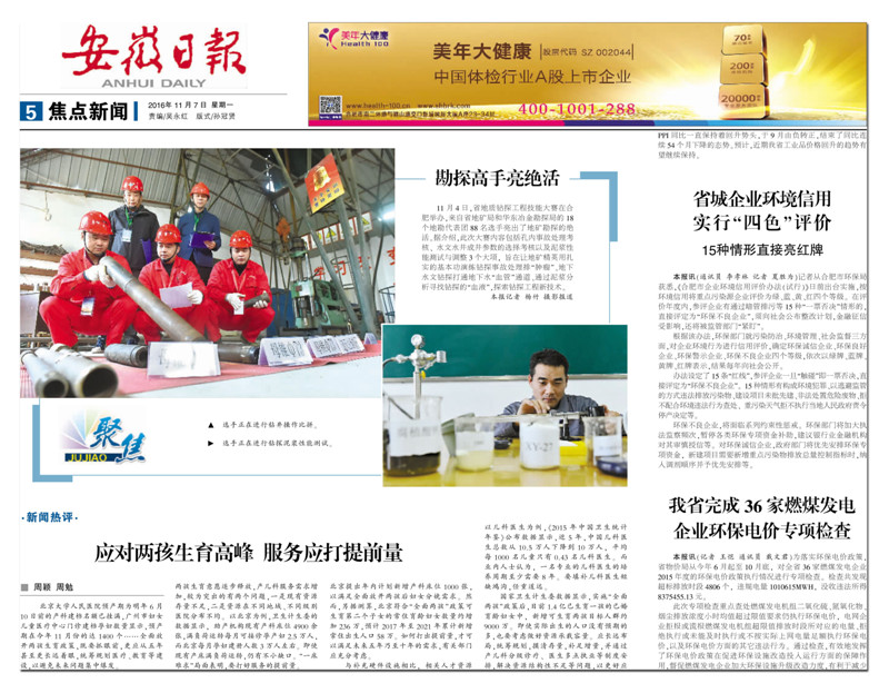 《安徽日报》2016年11月7日5版截图(左上图中三位身着红色工作服的为我队队员)