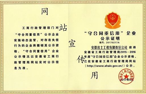 近日,队岩土公司在工商局领取了安徽省2015—2016年度“守合同重信用”获奖证书。这是岩土公司连续十年获得安徽省“守合同重信用”企业称号。