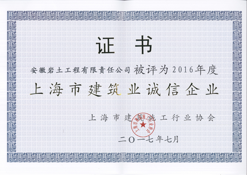 安徽岩土公司多年来一直秉持诚信经营的理念,用心维护着“安徽岩土”这块耀眼的品牌,连续十年获得诚信企业的称号也见证了“安徽岩土”的品牌和口碑是在漫漫岁月中淬炼出来的。也正是靠着多年遵守职业道德、坚持守法诚信经营,使岩土公司获得生存和发展的永恒动力,得到业内和社会的普遍认同和肯定,企业综合实力得到稳步提高,这让我们更加坚信安徽岩土工程有限责任公司的未来一定会更加灿烂辉煌。