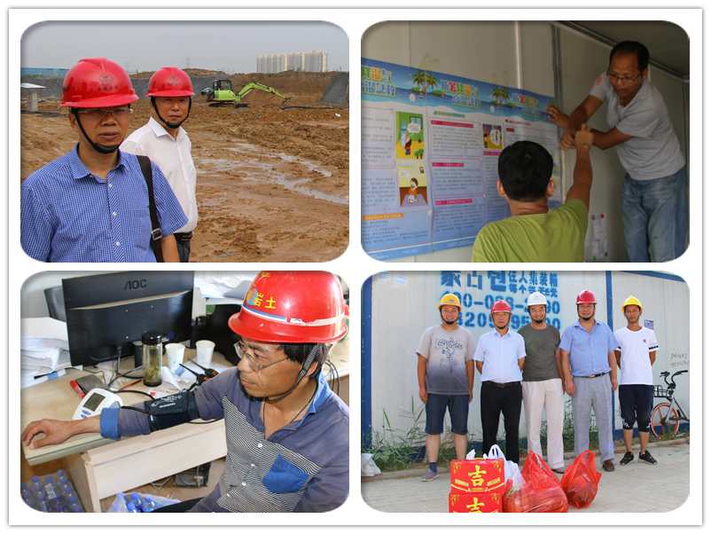 慰问组为奋战在一线的施工作业人员送去十滴水、红花油、清凉油、西瓜、绿豆、冰糖等防暑降温药品和物品。张贴了防暑降温宣传资料,用自动测压仪为现场人员测量血压,同时对项目现场人员的工作和生活情况进行了详细的了解与关注。